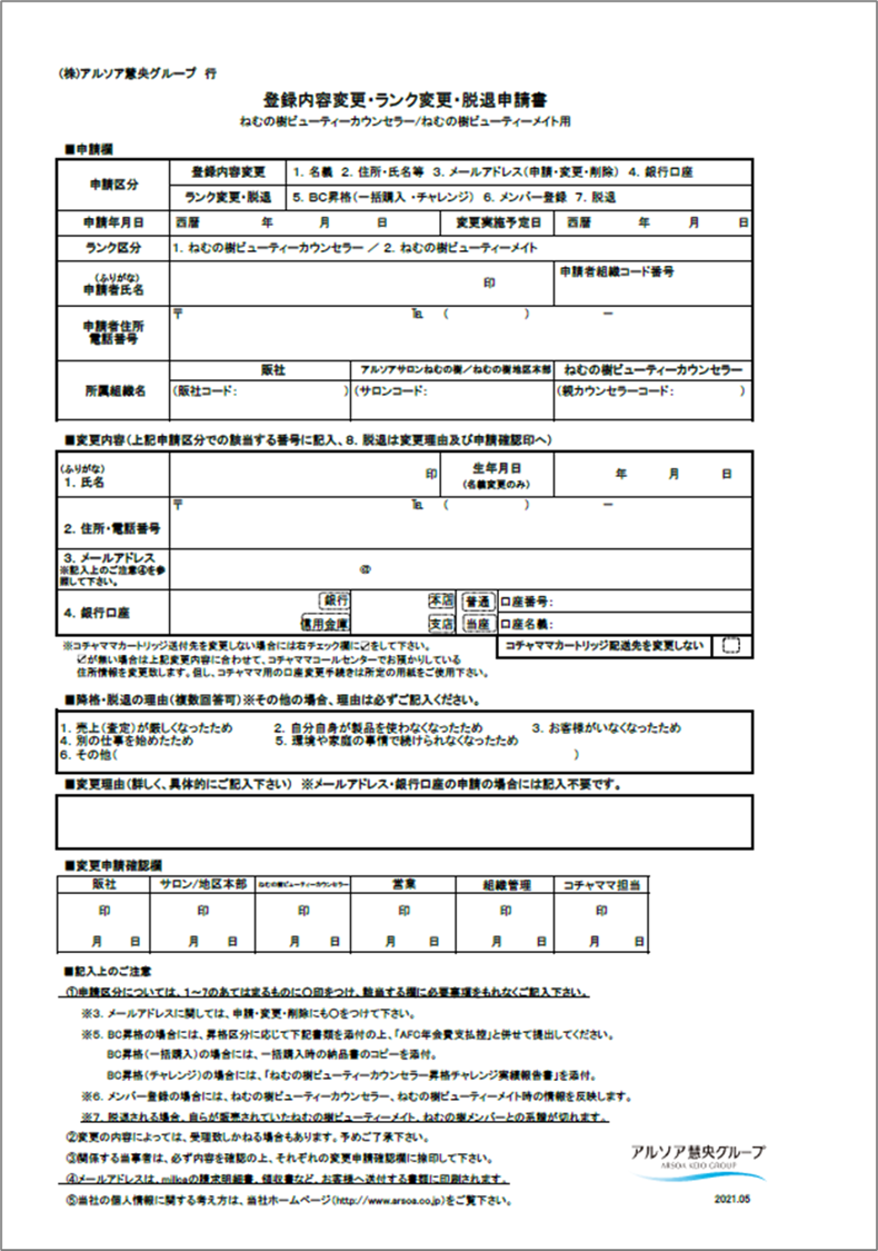 ホーム各種申請書・注文書BC登録内容変更・ランク変更・脱退申請書(2021年5月改定) 2021/02/22 2024/02/20ダウンロードは、青色リンクをクリックしてください。登録内容変更・ランク変更・脱退申請書_202105ダウンロード