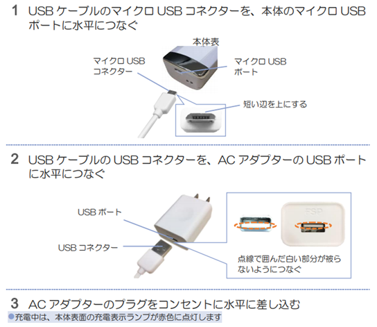 充電ケーブルを接続して頂き、本体ランプが赤点灯する場合には、充電切れと なります。一定時間充電したうえでご利用ください。充電しながらでもお使い頂くことができます。