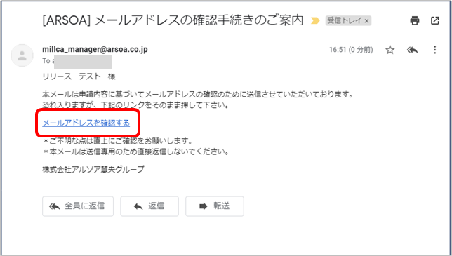④ 該当のメールアドレス宛に、以下メールが 届きますので「メールアドレを