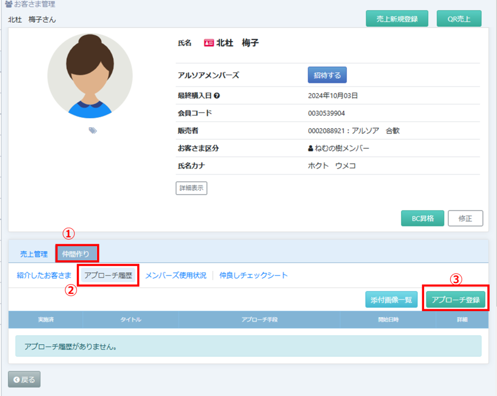 続いて、画面中ほどの ①「仲間作り」> ②「アプローチ履歴」から、③「アプローチ登録」を選択します。