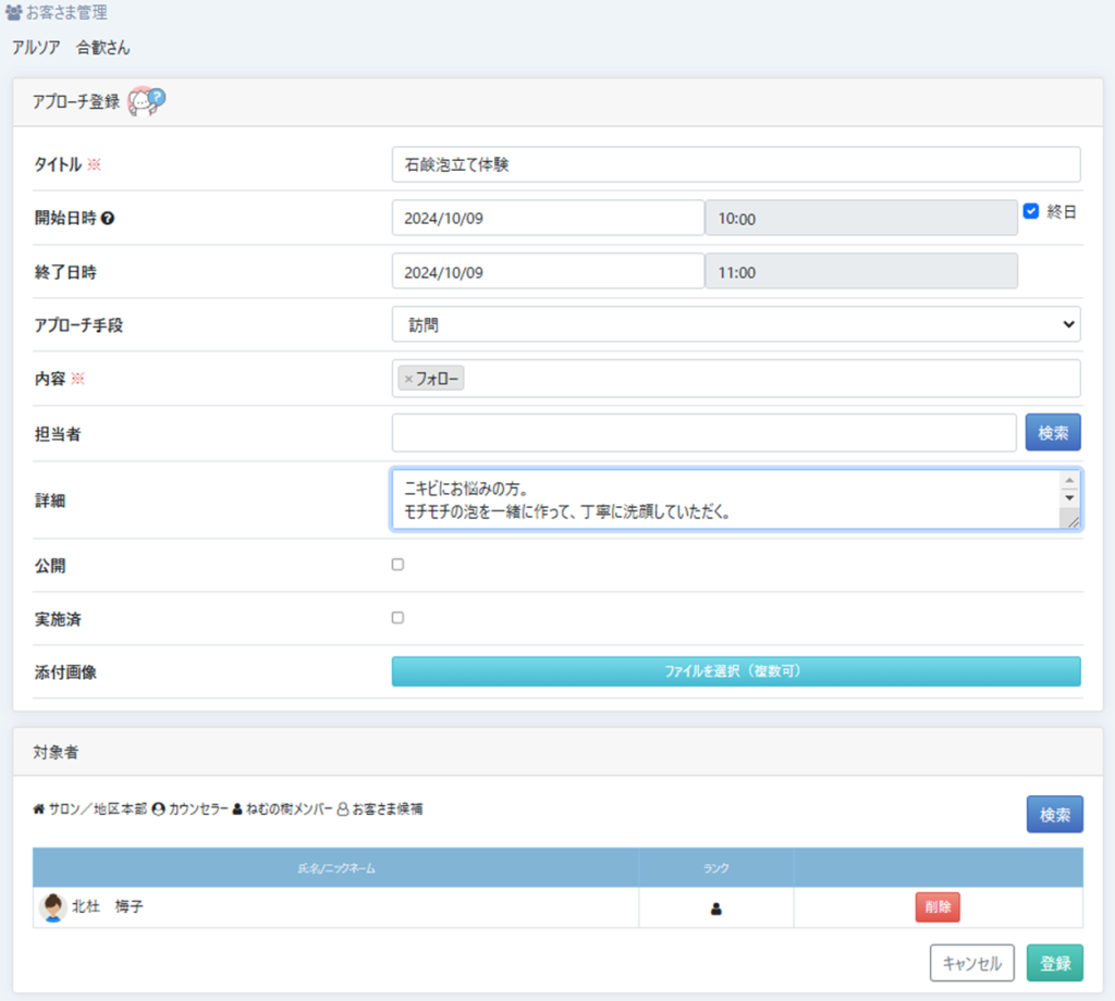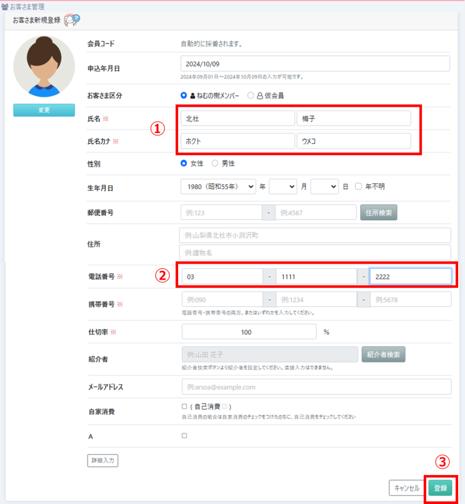 最後に「登録」ボタンを選択すると、お客さまの登録が完了です。