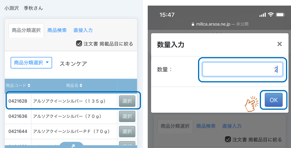 ご購入いただいた製品、数量を入力します。