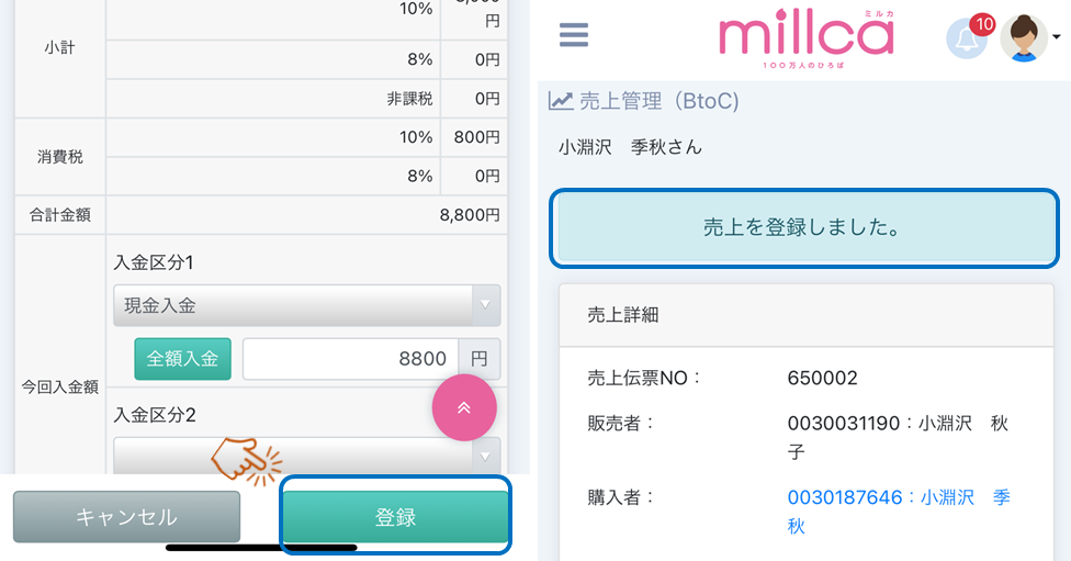 お客さまに製品をご購入いただいたら、millcaへ入力をしていきましょう。