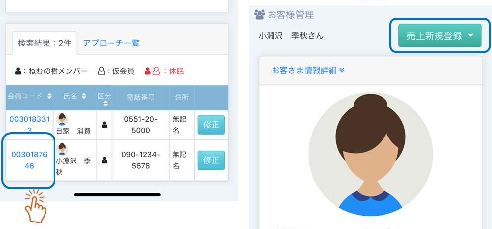 millcaメニュー「お客さま管理」>「お客さま会員コード」選択します。