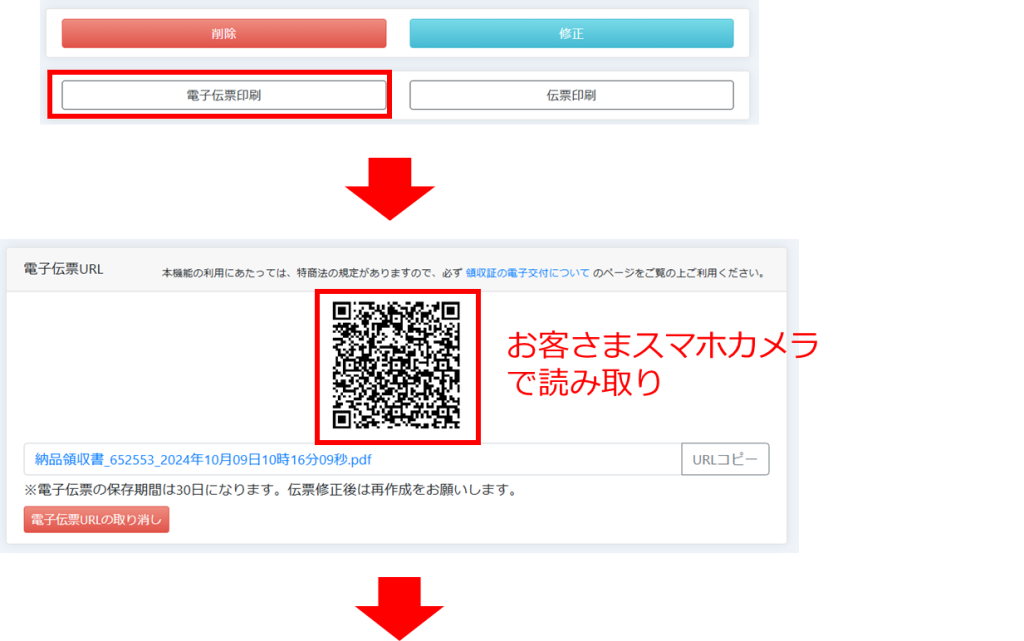 「簡易伝票」では、お客さまのスマホで読み込めるQRコードが表示され、印刷するお手間が省けます。