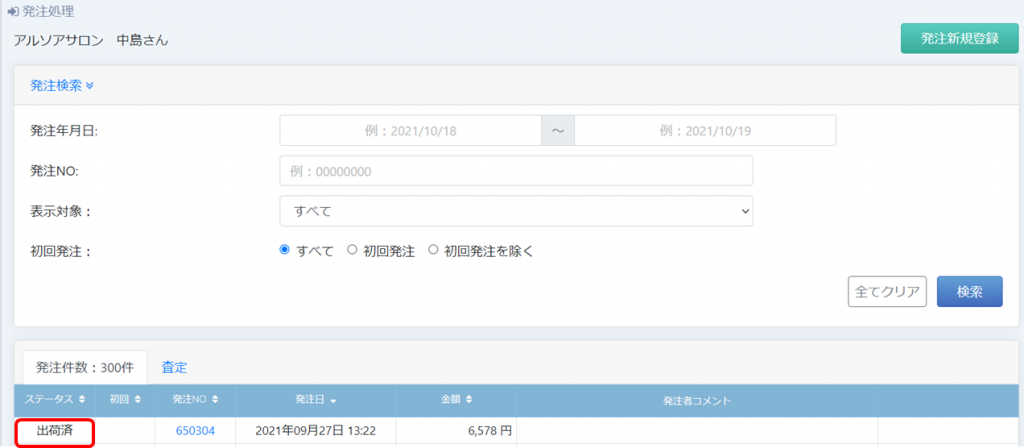 受注日当日の朝 8:50の連携時に「出荷済」に変わります。