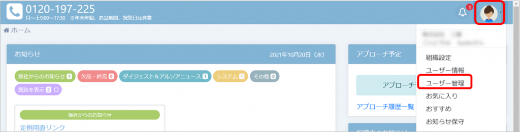 画面右上のアイコンより「ユーザー管理」を選択します。