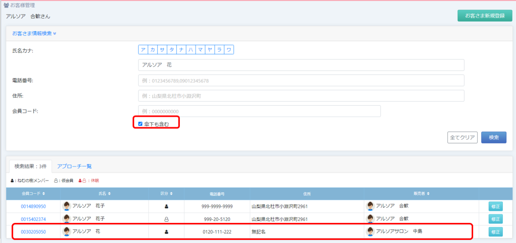 ① BtoC売上入力時、「傘下も含む」にチェックを入れて検索