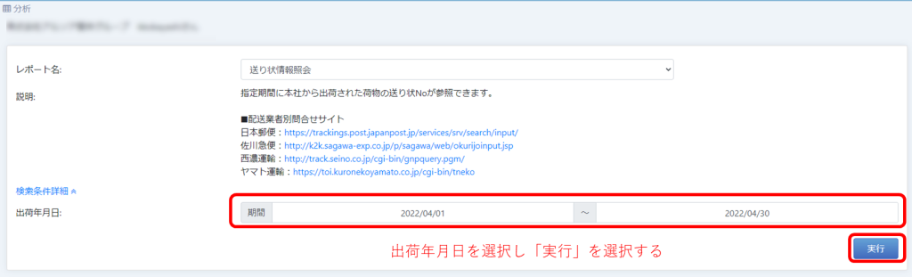 ② 出荷年月日を選択したあと、「実行」をクリックしてください。