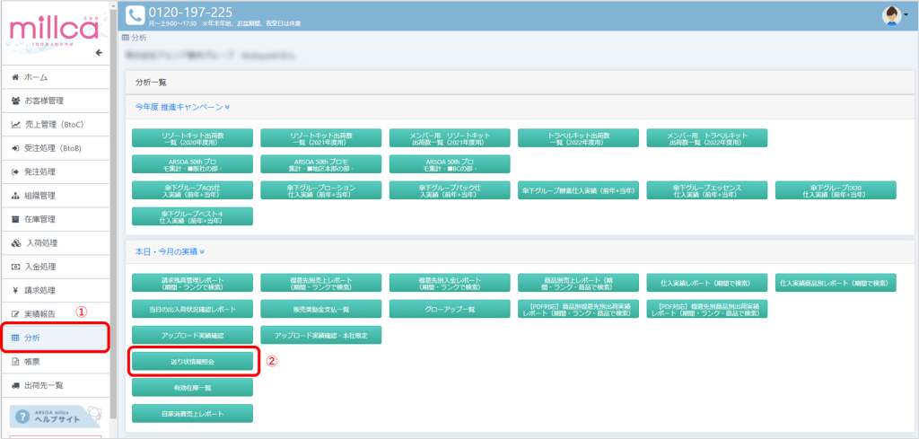 ① millca「分析」メニューより、「送り状情報照会」を開きます。