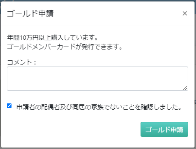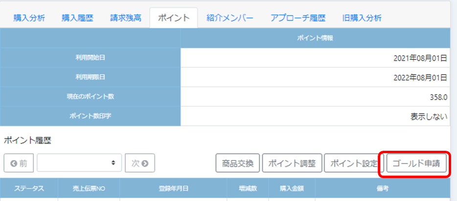 ・ゴールドメンバー申請機能・・・年間(3/1~2/28)に登録された売上伝票の上代合計が10万円以上になったお客様をゴールドメンバーにするための申請機能です。*上代合計10万円以上の売上伝票登録がない場合は申請できません。