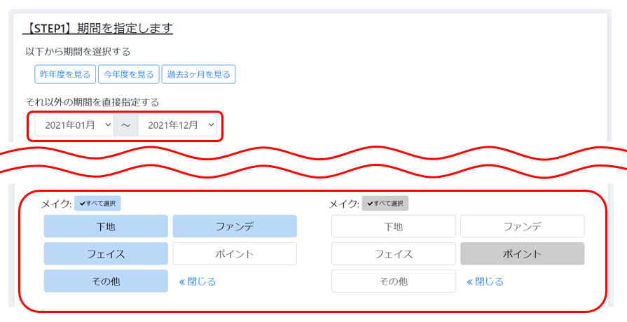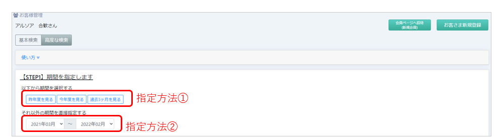 「昨年度を見る」「今年度を見る」「過去3ヶ月を見る」 それぞれのボタン を選択すると、自動的に期間が入力されます。