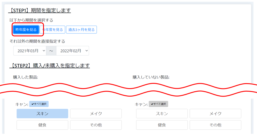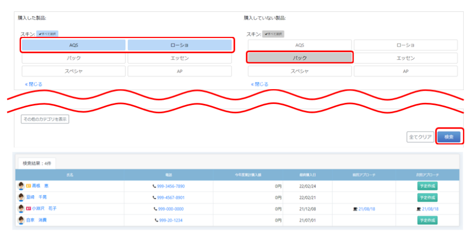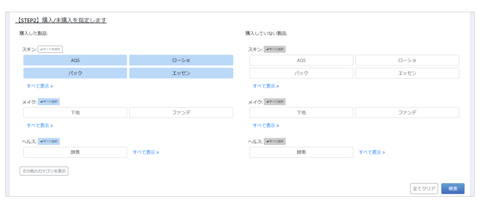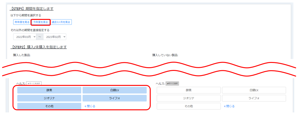STEP2:購入製品と未購入製品を選択した後、検索ボタンを押す