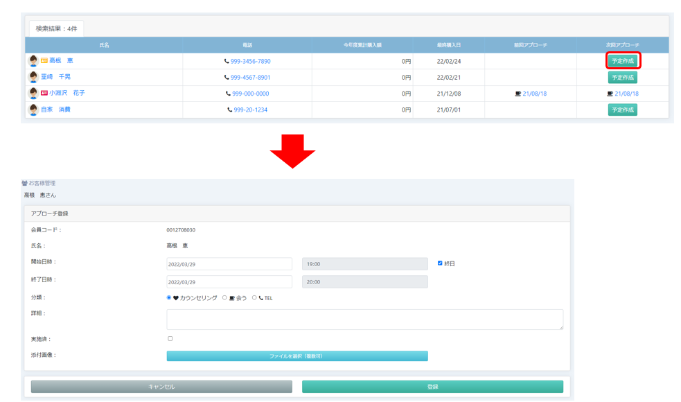 「予定作成」ボタンを選択すると、アプローチ登録画面が表示されます。