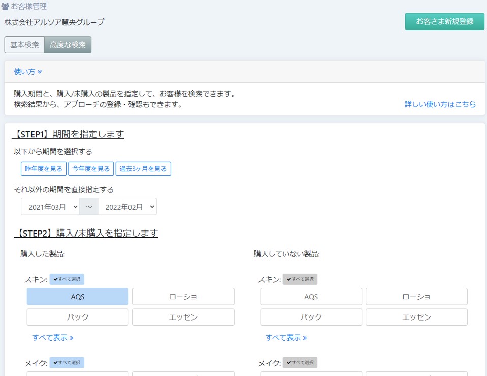 購入している製品や、購入していない製品を条件に検索することができます。