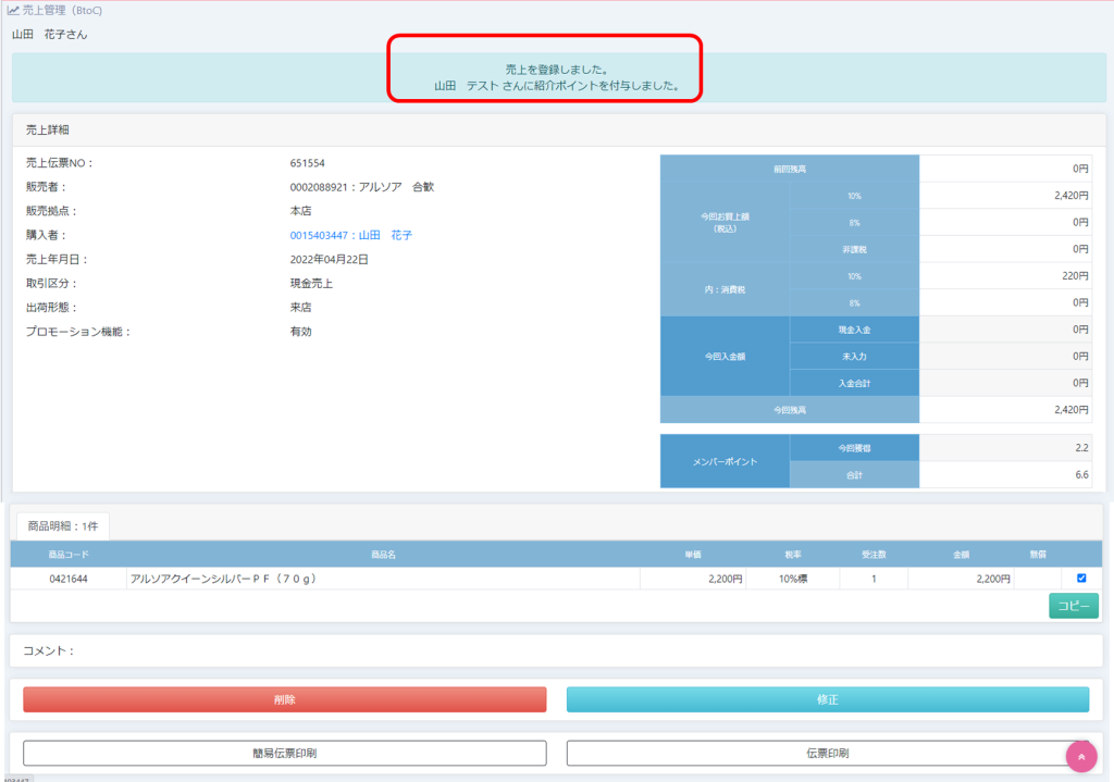 ④初回売上登録後、「紹介ポイントを付与しました」と表示されます。