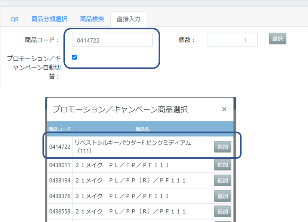 お客さま、傘下組織への伝票作成時、直接入力で【プロモーション/キャンペーン自動切換☑】の状態で商品コードを入力すると、そのコードがプロモーション対象製品だった場合、製品が含まれているプロモーションコードが商品選択画面に表示されていました。