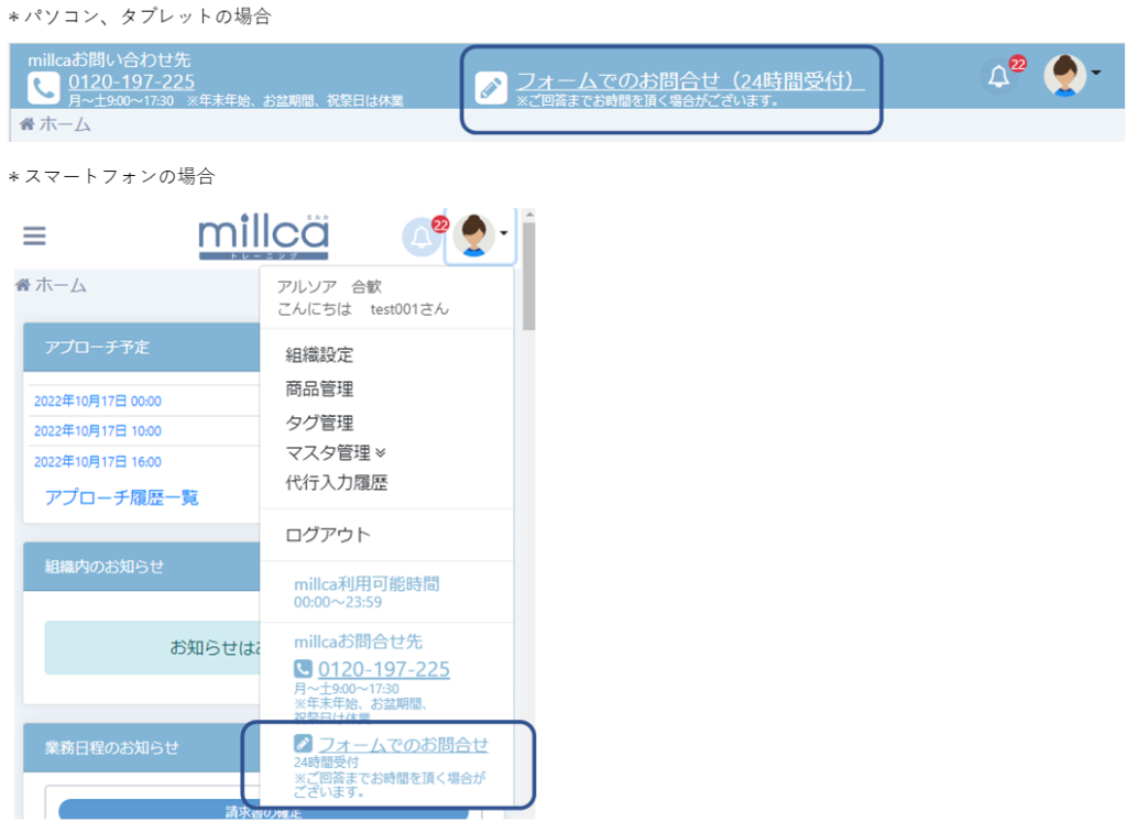 millca操作方法等に関するお問合せについて、お問合せフォームをご用意しました。