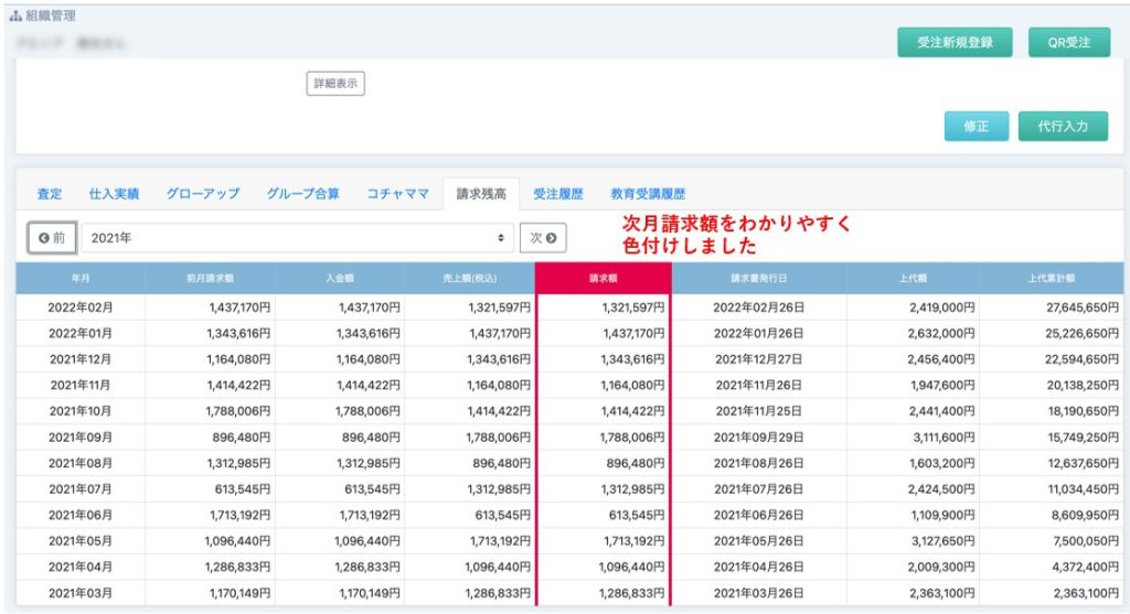 ホーム請求処理【リリース】請求残高タブにおいて次月請求額をわかりやすく表示するようにしました(2022/6/27リリース) 2022/06/27 2024/08/21「請求残高タブ」において「次月請求額」を色付けし、わかりやすく表示するようにしました。
