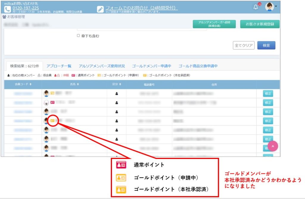 ホームお客さま・お客さま候補の管理【リリース】お客様管理にてゴールドメンバーの承認状況がわかるようになりました(2022/6/27リリース) 2022/06/27 2024/08/27「お客様管理」画面において、ゴールドメンバーの本社承認状況をアイコンで表示するようにしました。