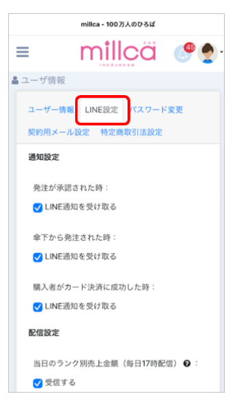 なお、LINE連携を行ってmillcaをご利用いただいている販売者の方につきましては