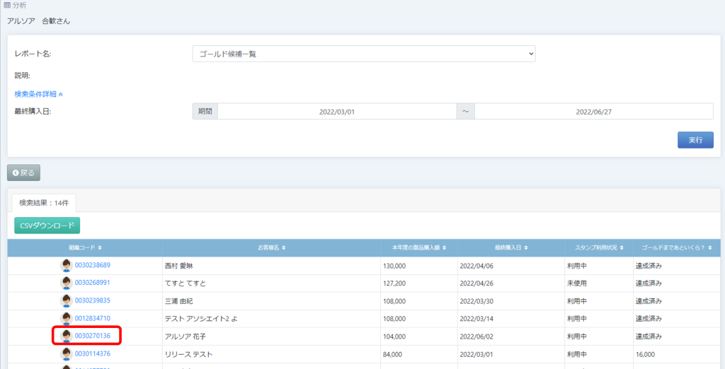 お客様コードのリンクより、該当者の詳細画面を表示頂けますので、ゴールド申請をおこなってください。