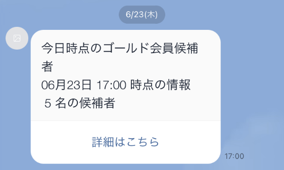 設定を行って頂くことで、毎日17時に以下のご連絡がLINEトーク内に表示されるようになります。