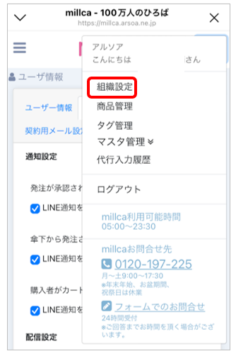 LINEよりmillcaを開いていただき、組織管理→LINE設定タブを開きます。