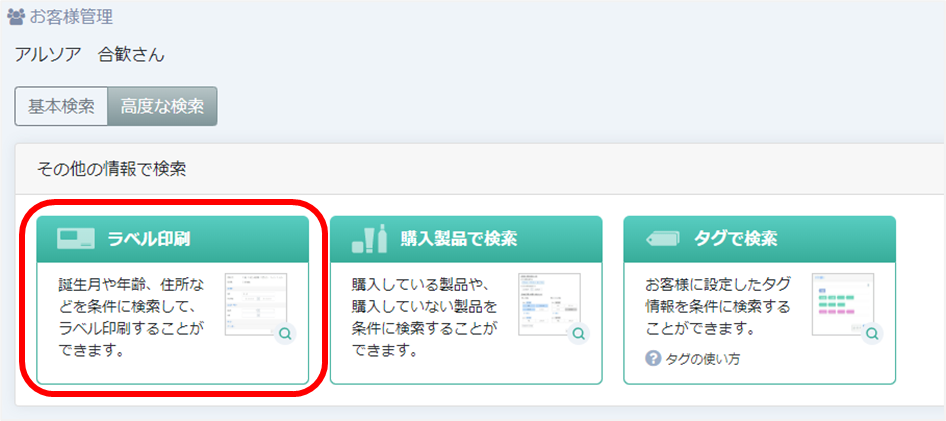 ②お客様管理>高度な検索>ラベル印刷(表示される画面は①と同じです)