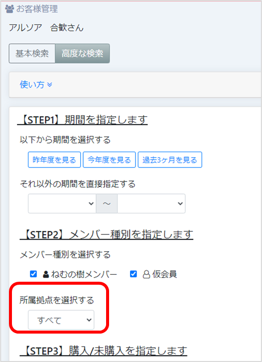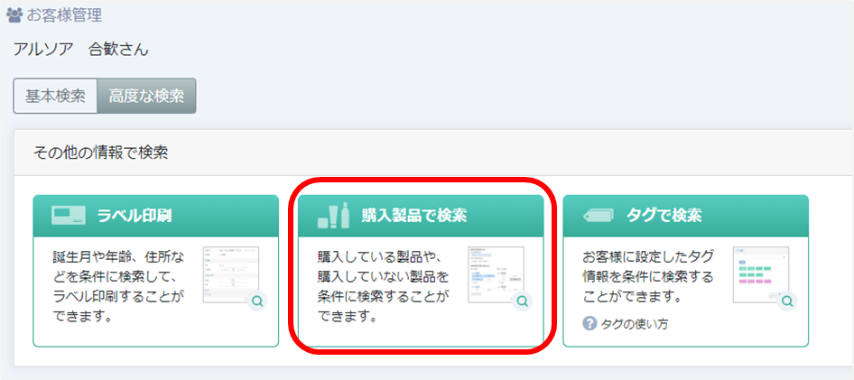 ③お客様管理>高度な検索>購入製品で検索