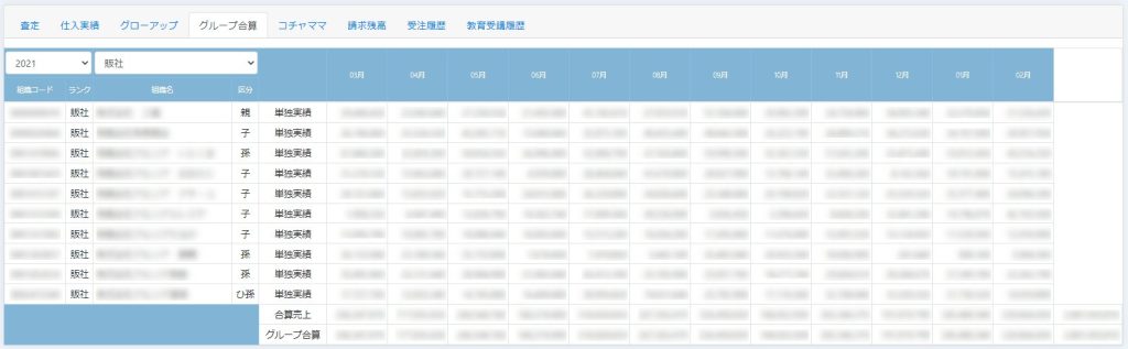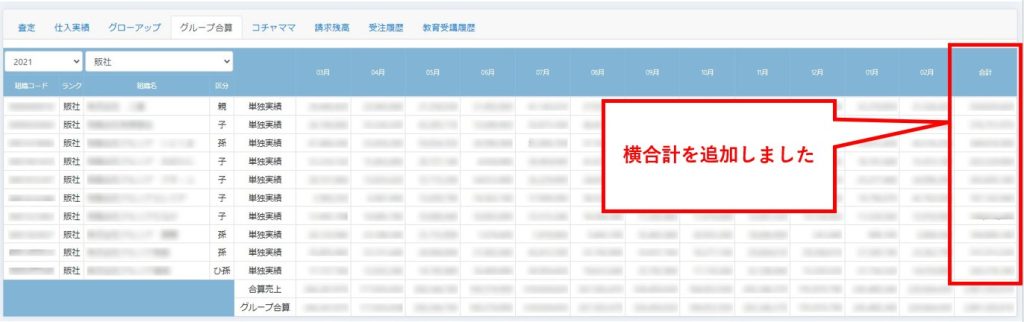 ホーム組織管理【機能改善】グループ合算にて横合計を表示するようにしました(2022/9/26リリース) 2022/09/26 2024/08/26「組織管理」-「グループ合算」タブにおいて、横合計を表示するようにしました。(変更前)(変更後)