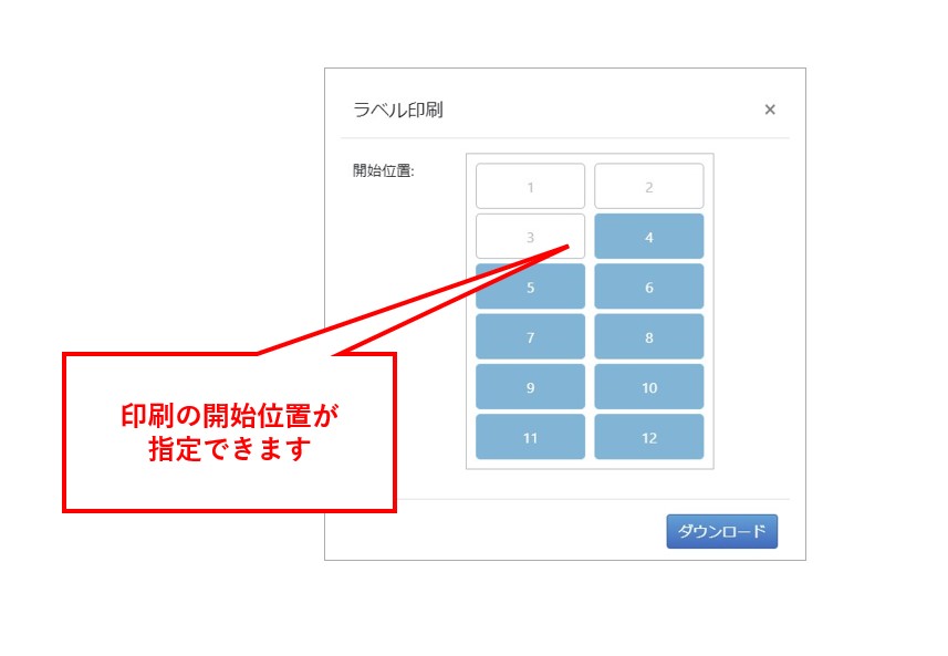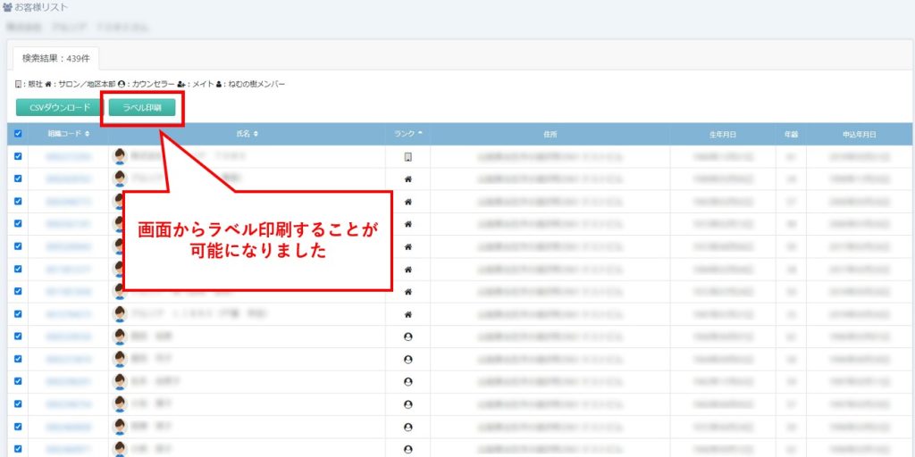 ホームお客さま・お客さま候補の管理【新機能】ラベル印刷機能が利用可能になりました(2022/9/26リリース) 2022/09/26 2024/08/26ラベル印刷については、今までは「帳票印刷ツール」を利用した印刷方法でしたが、より簡単に印刷できるよう、お客様リストの画面から直接印刷することが可能になりました。なお、使いかけのラベルも利用できるよう印刷開始位置も指定できるようになっています。