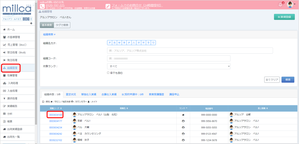 「組織管理」メニューより、ご自身の組織コードリンクをクリックします。