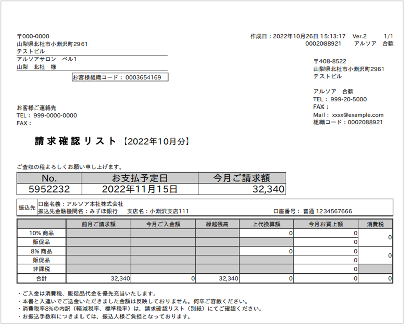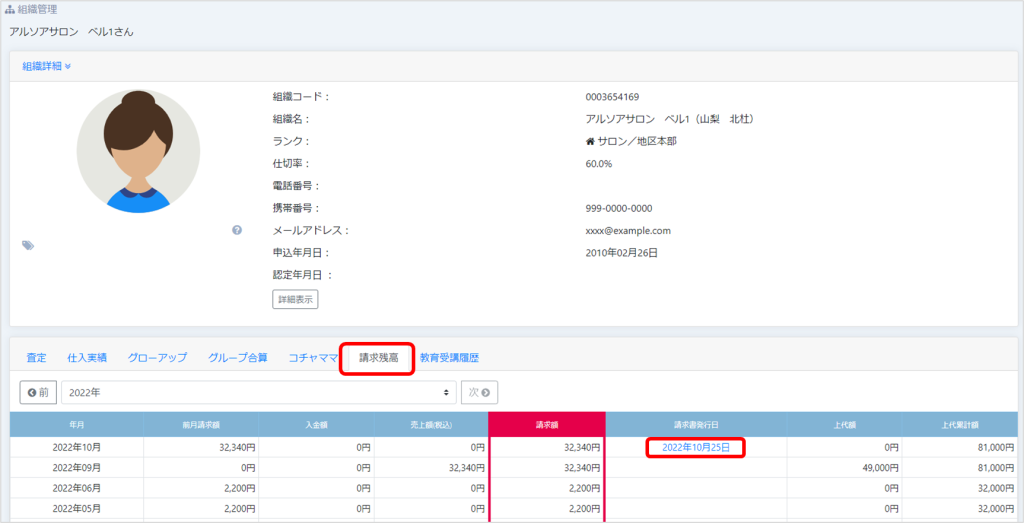②傘下組織では、ご自分の組織情報詳細画面の「請求残高」タブより請求書を出力頂けます。