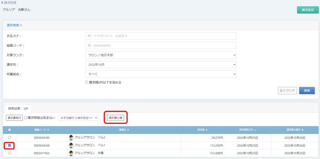 「請求処理」画面より検索結果に表示された対象者のチェックボックスに☑を入れて「請求書公開」ボタンを押します。(これまで通り、紙面発行をされたい場合は「請求書発行」をご利用いただけます)