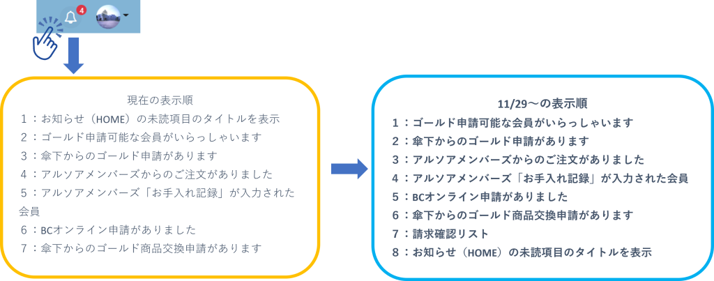 ホームリリースノート【要望】ベルアイコン 表示項目の順番を変更しました(2022/11/28リリース) 2022/11/28 2024/08/26大変便利に使っていると、ご好評をいただいているベルアイコン表示について、表示項目の順番を見直しました。