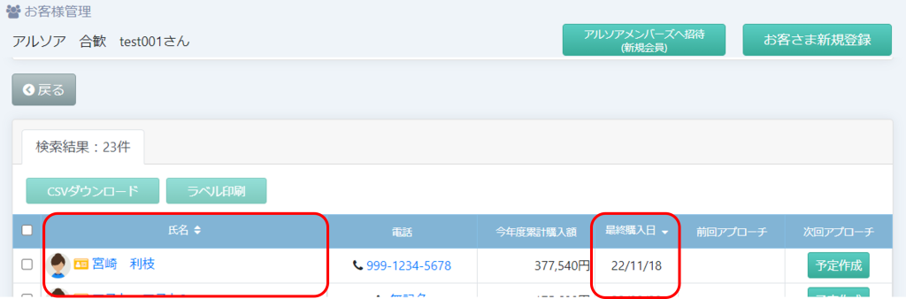 ホームお客さま・お客さま候補の管理【要望】高度な検索 購入製品で検索 検索結果を並び替えできるようにしました(2022/11/28リリース) 2022/11/28 2024/08/26ホーム>お客さま管理>高度な検索>購入製品で検索購入製品で検索を行った際、表示された結果を並び替えすることができませんでした。そこで、氏名、最終購入日で並び替えができるようにしました。