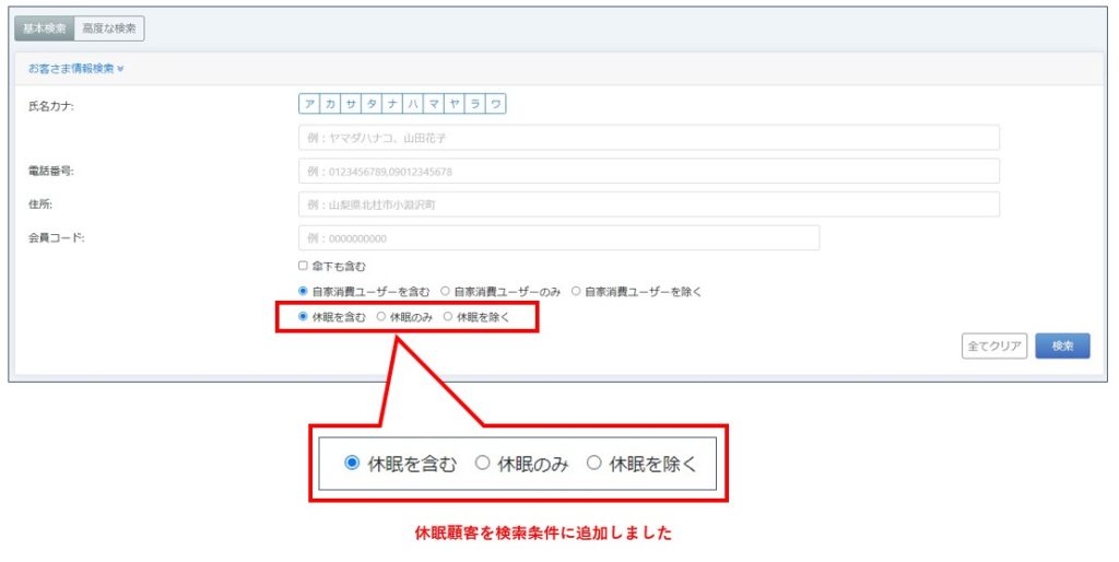 条件を「最終購入日が1年以上前」または「お客様の登録日から1年以上購入がない」に変更するとともに、お客様の検索条件に「休眠顧客」を追加し、検索をしやすくしました。