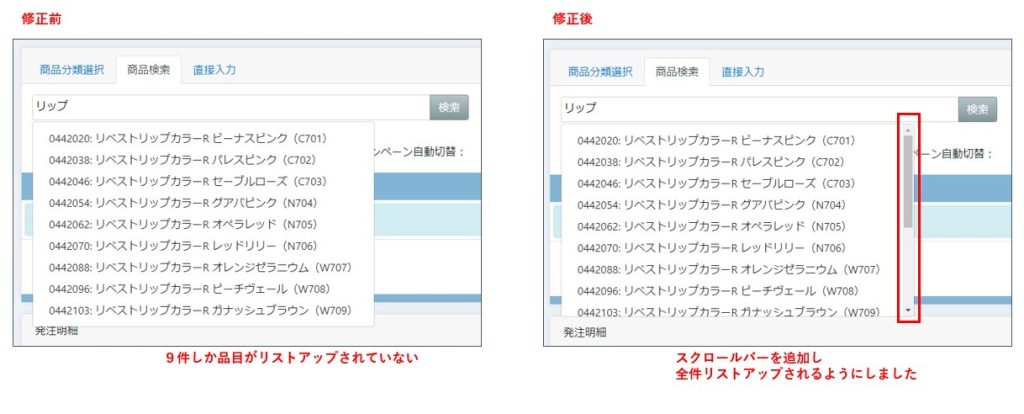 ホーム売上(BtoC)【不具合】「商品検索」の際、キーワードでリストアップした場合、件数が多いとすべて表示されない不具合を修正しました(2022/12/26リリース) 2022/12/26 2024/08/23ホーム>売上管理(BtoC)ホーム>受注処理(BtoB)ホーム>発注処理「商品検索」の際、キーワードで検索で品目をリストアップした際、件数が多い場合すべて表示されていませんでしたが、スクロールバーを表示し、すべて表示されるようにしました。