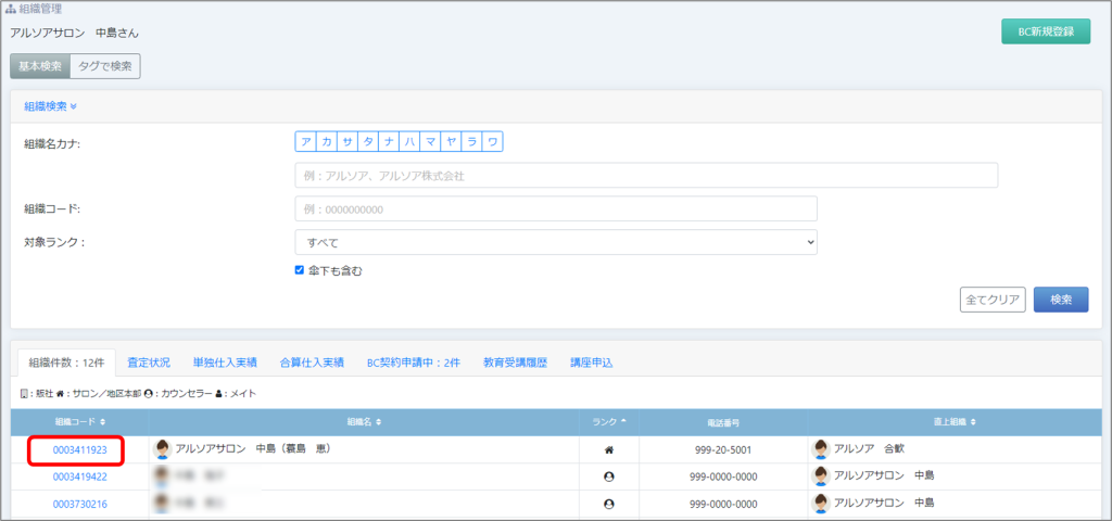 ① 「組織管理」メニューより、ご自分の「組織コード」を選択して組織詳細を開きます。