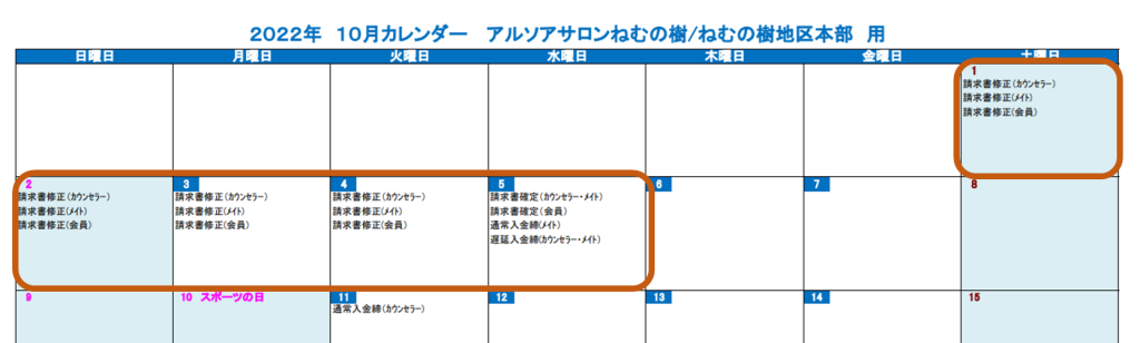 (注意!10/5請求書確定(カウンセラー)とありますが、5日の23:30まで、前月分伝票起票が