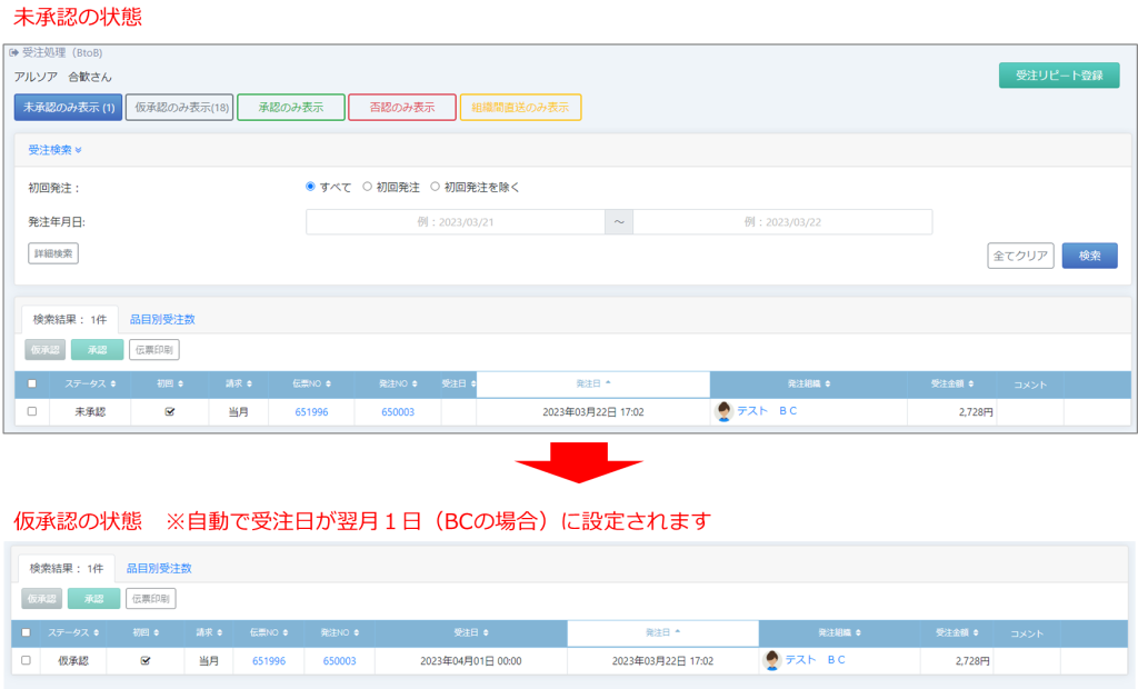 3月度に、初回☑が入っている「未承認」伝票を「仮承認」にすると受注日が「4月1日」になります。