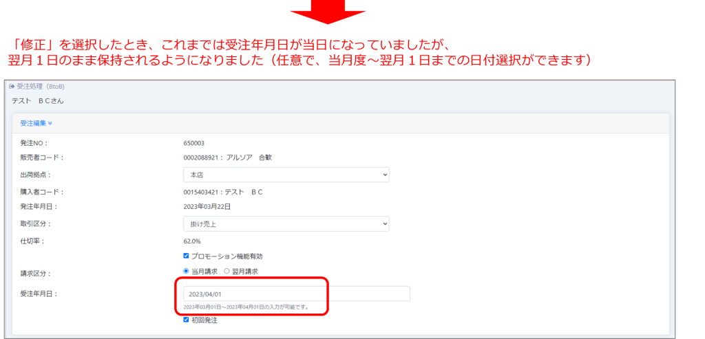 「傘下からの初回チェックが入った受注伝票を修正するとき、翌月度の日付が選択できなくなり不便」