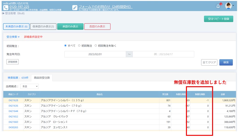 ホーム受注処理(BtoB)【修正】「受注管理(BtoB)」の「商品別受注数」タブに無償在庫数を追加しました(2023/04/24リリース) 2023/04/24 2024/08/28ホーム>受注管理(BtoB)「受注管理(BtoB)」画面の「商品別受注数」タブに無償在庫数を追加しました。