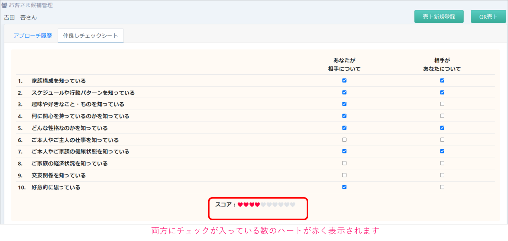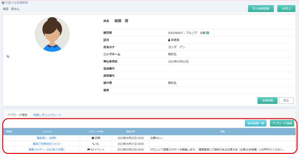 仲良しチェックシートの入力、アプローチの履歴管理、お客さまへの昇格処理など