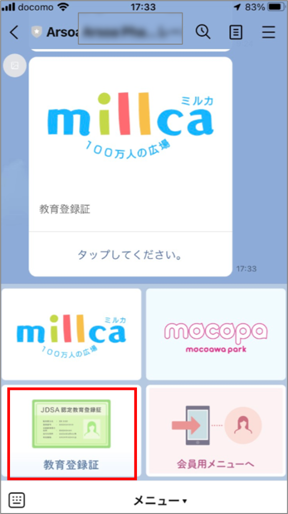 リッチメニュー内の「教育登録証」メニューを選択します。
