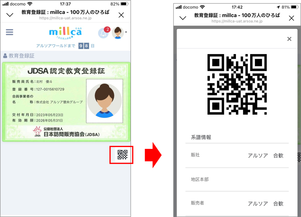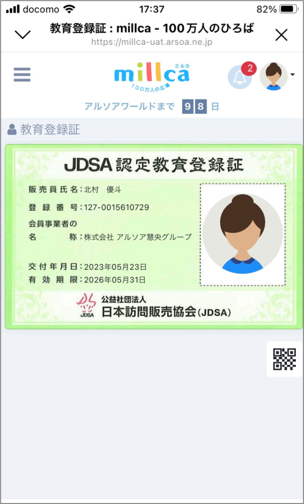 LINE連携したあとのリッチメニューで、訪販協の教育登録証が表示されるようになりました。