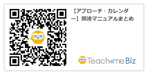 ホームお客さま・お客さま候補の管理【簡単マニュアル】アプローチ・カレンダー まとめ(2023/5/24UP) 2023/05/24 2024/08/29JPやスタディ、イベントなどの予定を作成し、カレンダー管理ができます。集客人数管理も可能です。【アプローチ・カレンダー】関連マニュアルまとめhttps://teachme.jp/131668/manuals/22298386スマートフォンでQRコードを読み込むと、 マニュアルにすばやくアクセスできます
