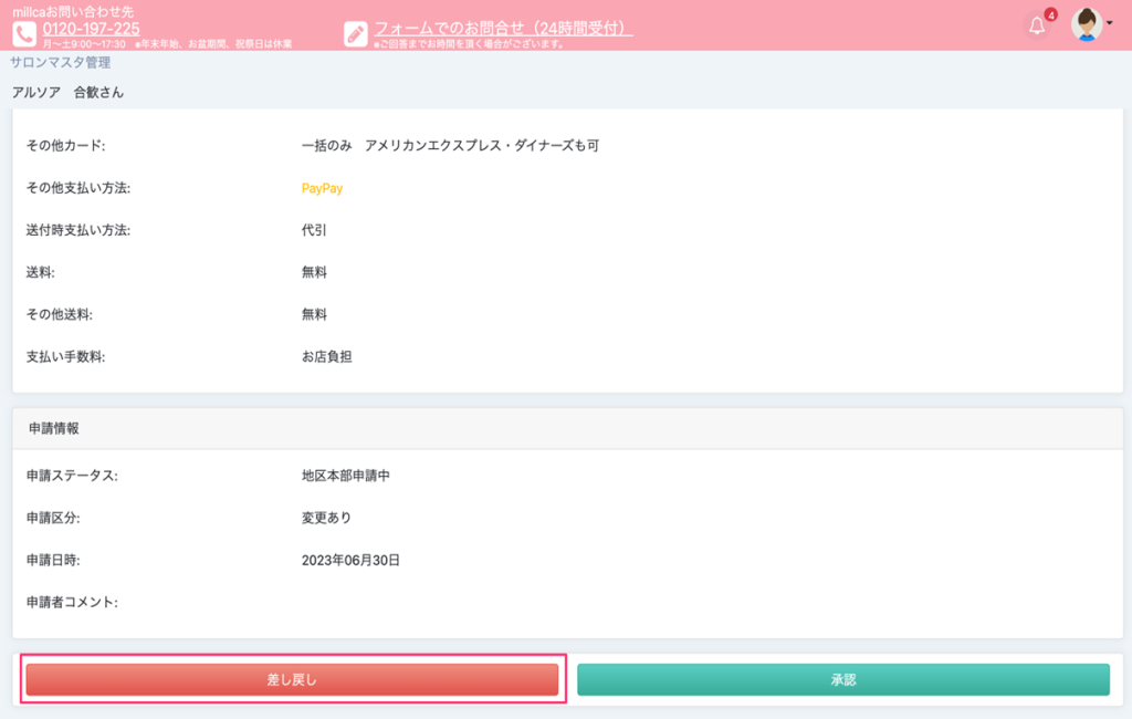 地区本部がサロンマスタ申請登録をした際、販社においては承認のみ可能で差し戻すことができませんでした。「地区本部において修正を行いたいケースがあるため差し戻し機能を追加してほしい」