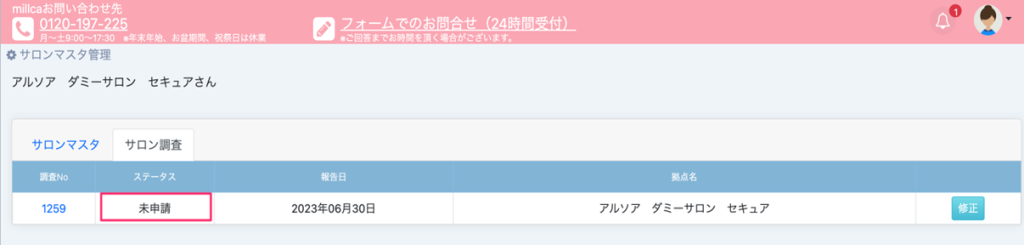 差し戻し後、サロンの画面で「未申請」として表示されます
